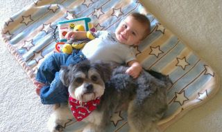Hello Kathy, I am so happy to say that Rockee, now know as Teddy, aka Ted E Bear, is doing GREAT! He's fitting right in, as if he has always been here. He get's along so well with all the dogs in the neighborhood as well as my grandson, which is so important. He really is becoming my best friend. I've attached some pictures of him with my grandson as well as him at home. Thank you again, Sue Hiro