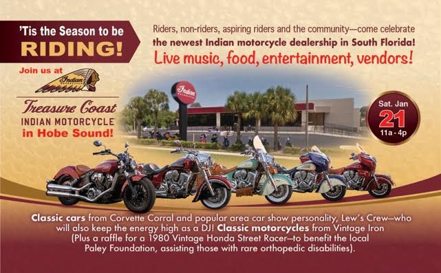 Saturday January 21st, 2017 11:00 AM until 04:00 PM Location: Treasure Coast Indian Motorcycle, Hobe Sound (772) 252-5000